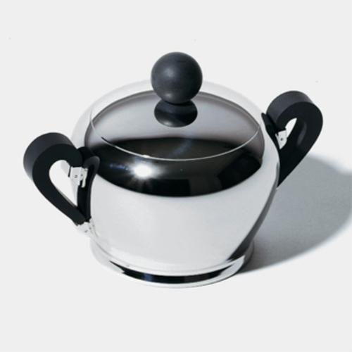 Zuckerdose aus Edelstahl 18/10 glänzend poliert mit Griffen und Knopf aus Bakelit.