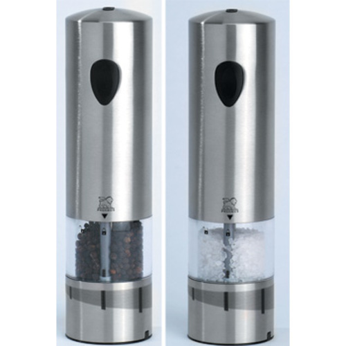 Salz- & Pfeffermühlenset mit elektrischem Peugeotmahlwerk, Untersetzer und Licht aus der Serie Elis. Stufenlose Mahlwerkeinstellung (U' Select System) über den unteren Edelstahlring. Lieferung ohne Batterien inkl. Füllung (Pfeffer/ Salz)