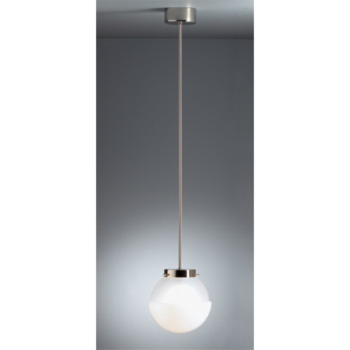 Deckenleuchte aus vernickeltem Metall, Glaskugel ätzmatt und opal weiß glänzend.