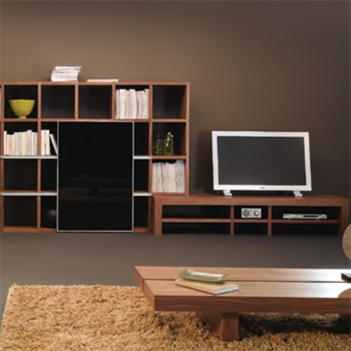 Wandregal mit Glasschiebetür und integriertem TV Tisch