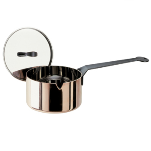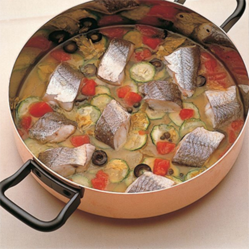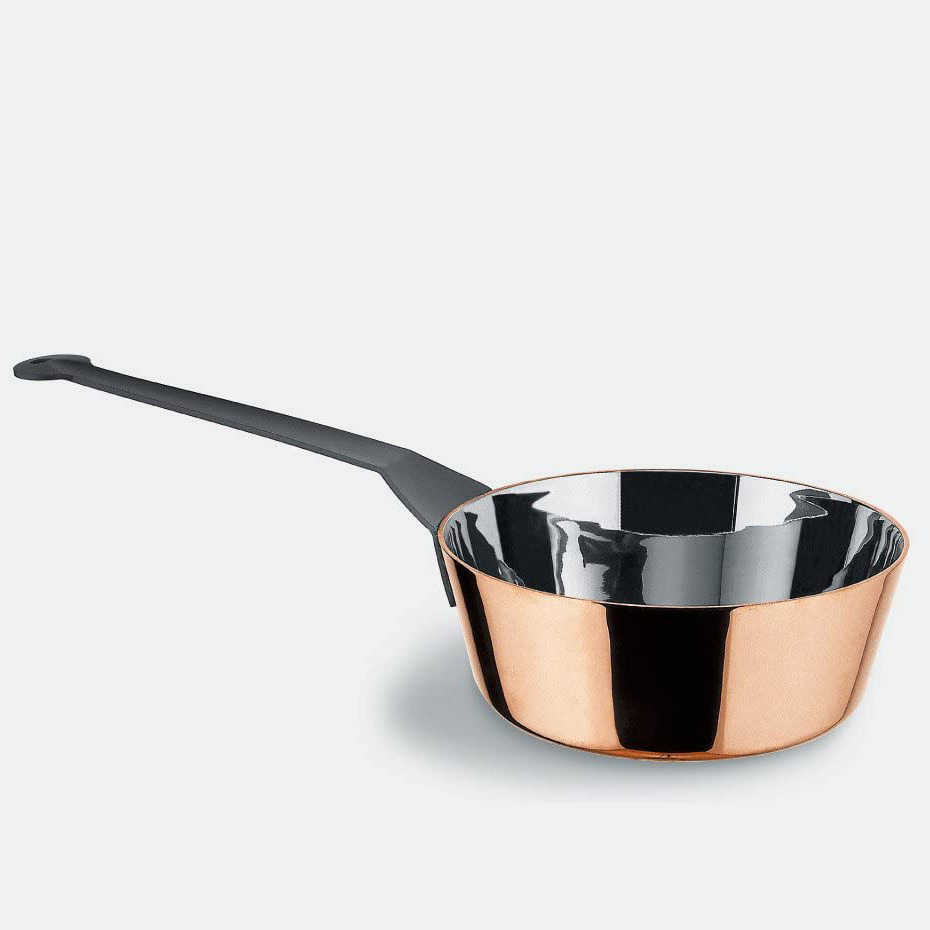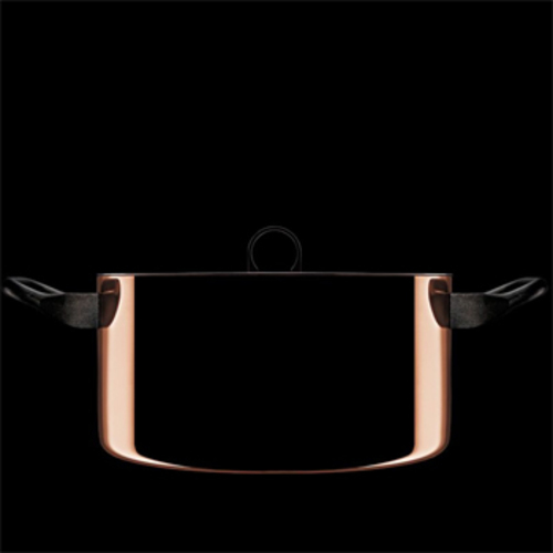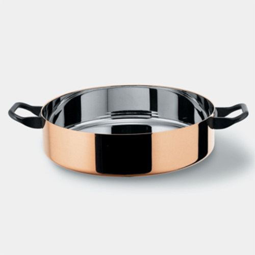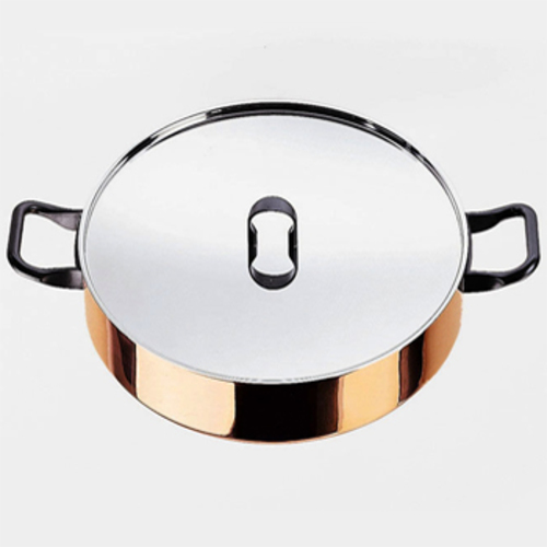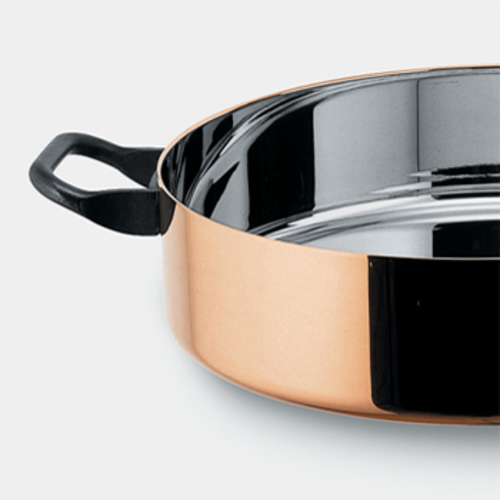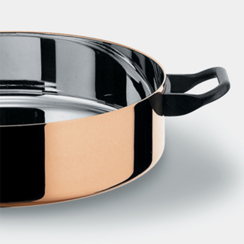 Flache Kasserolle mit zwei Griffen aus Edelstahl 18/10 und Kupfer.