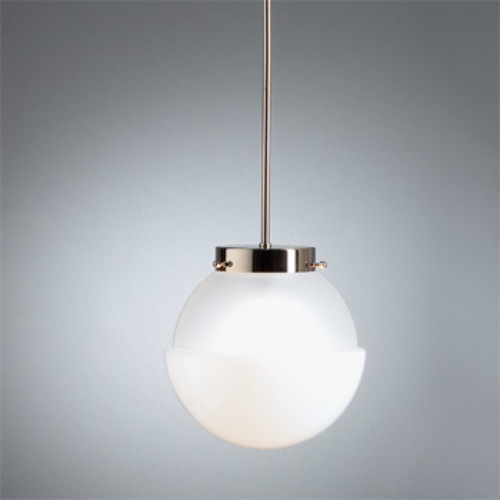 Deckenleuchte aus vernickeltem Metall, Glaskugel ätzmatt und opal weiß glänzend.