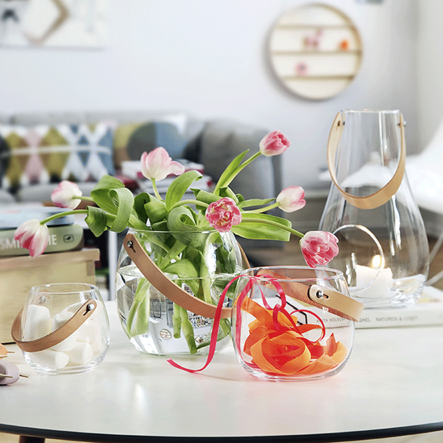 Design With Light Klare Glasschale mit Lederhenkel [Höhe 12 cm]