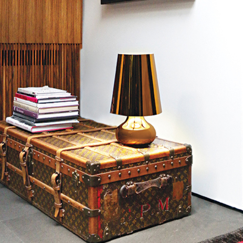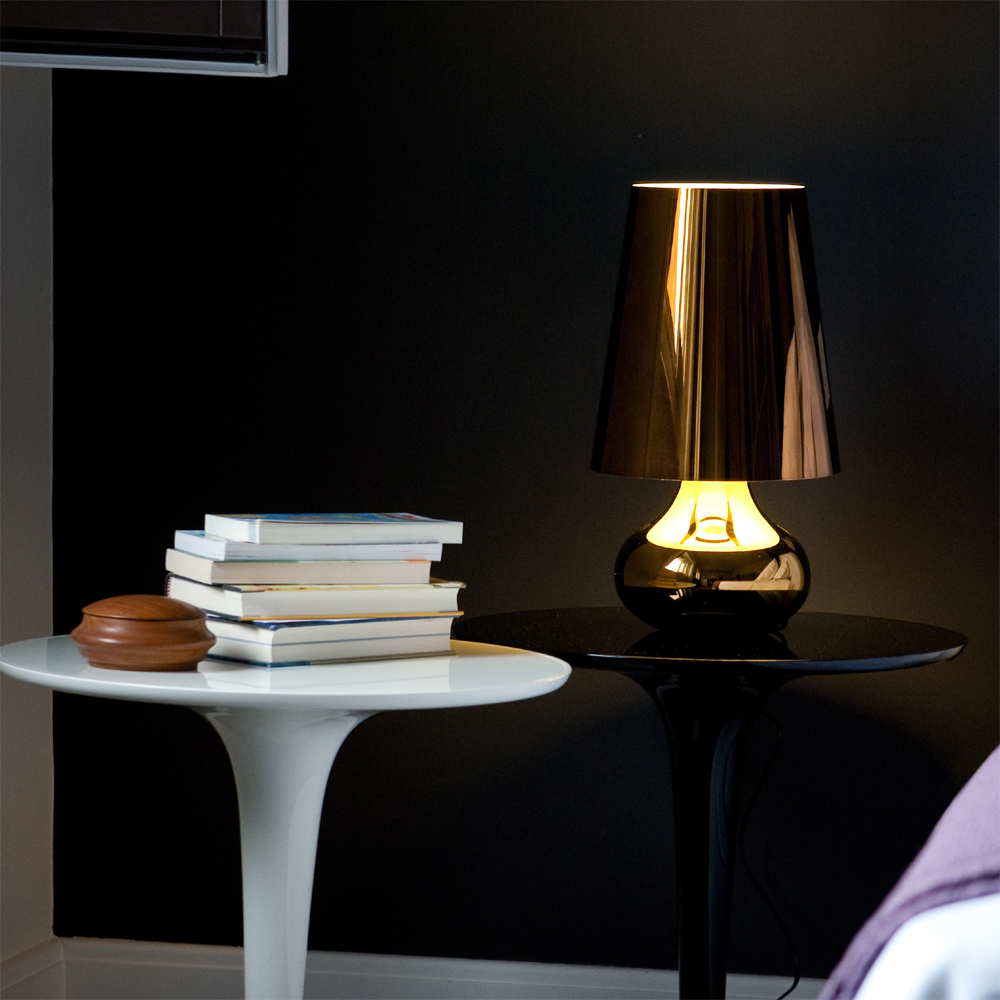 Die typische Tischleuchte der 70er Jahre in neuer Form und Farbe. Die Nachttischlampe Cindy besteht aus einem kegelförmigen Schirm und einem runden Fuß, der in eine Tropfenform ausläuft. Sie wird jetzt in vier ganz neuen, deckenden Metallictönen angeboten: Platin, Dunkelgold, Mintgrün, Orange, Blau, Rosa, Graumetallic und Violett. Die Besonderheit von Cindy ist ihre glänzende Oberfläche. Die Verchromung verleiht ihr etwas Aktuelles und Wertvolles und erzeugt unzählige schimmernde Reflexe.