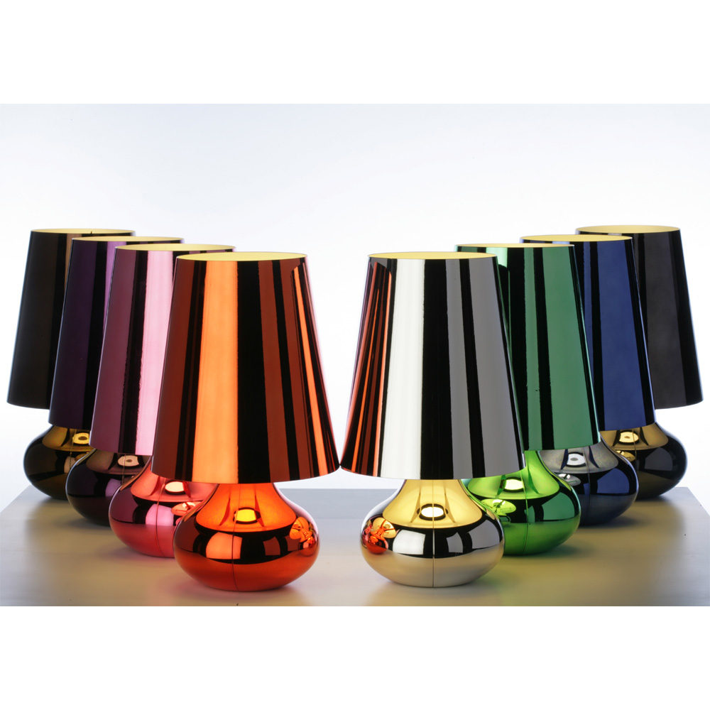 Die typische Tischleuchte der 70er Jahre in neuer Form und Farbe. Die Nachttischlampe Cindy besteht aus einem kegelförmigen Schirm und einem runden Fuß, der in eine Tropfenform ausläuft. Sie wird jetzt in vier ganz neuen, deckenden Metallictönen angeboten: Platin, Dunkelgold, Mintgrün, Orange, Blau, Rosa, Graumetallic und Violett. Die Besonderheit von Cindy ist ihre glänzende Oberfläche. Die Verchromung verleiht ihr etwas Aktuelles und Wertvolles und erzeugt unzählige schimmernde Reflexe.