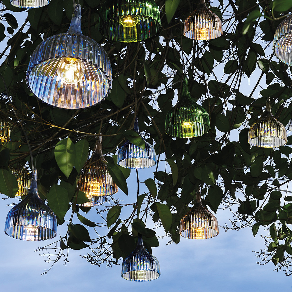 Die Wandleuchte besteht aus einem runden Schirm aus plissiertem Polycarbonat, der in verschiedenen Farbvarianten erhältlich ist, und einem 11 cm langen Arm aus verchromtem Metall. Die Hängeleuchte dieser Serie besteht aus einem Schirm aus plissiertem Polycarbonat und einer Deckenrose aus verchromtem Metall. Die Aufhängung ist zwischen mindestens 20 cm und höchstens 220 cm höhenverstellbar.