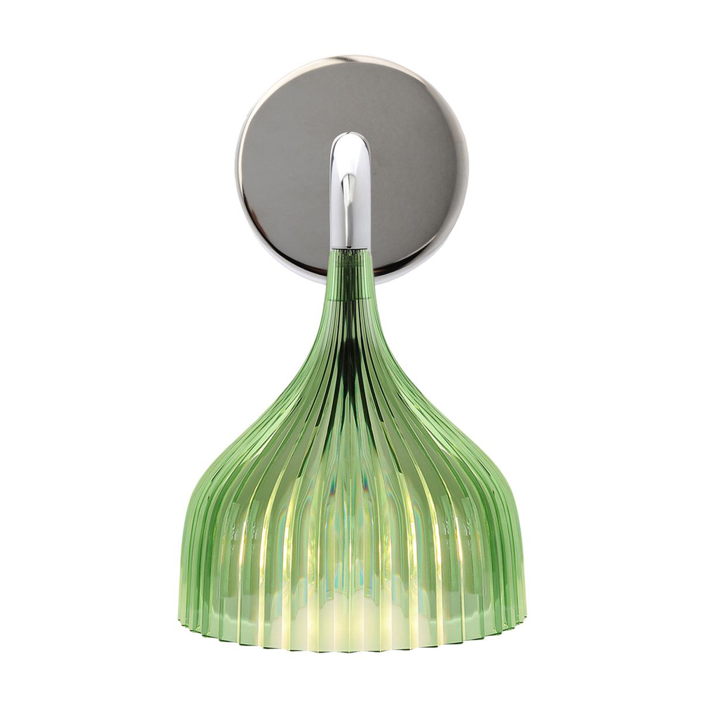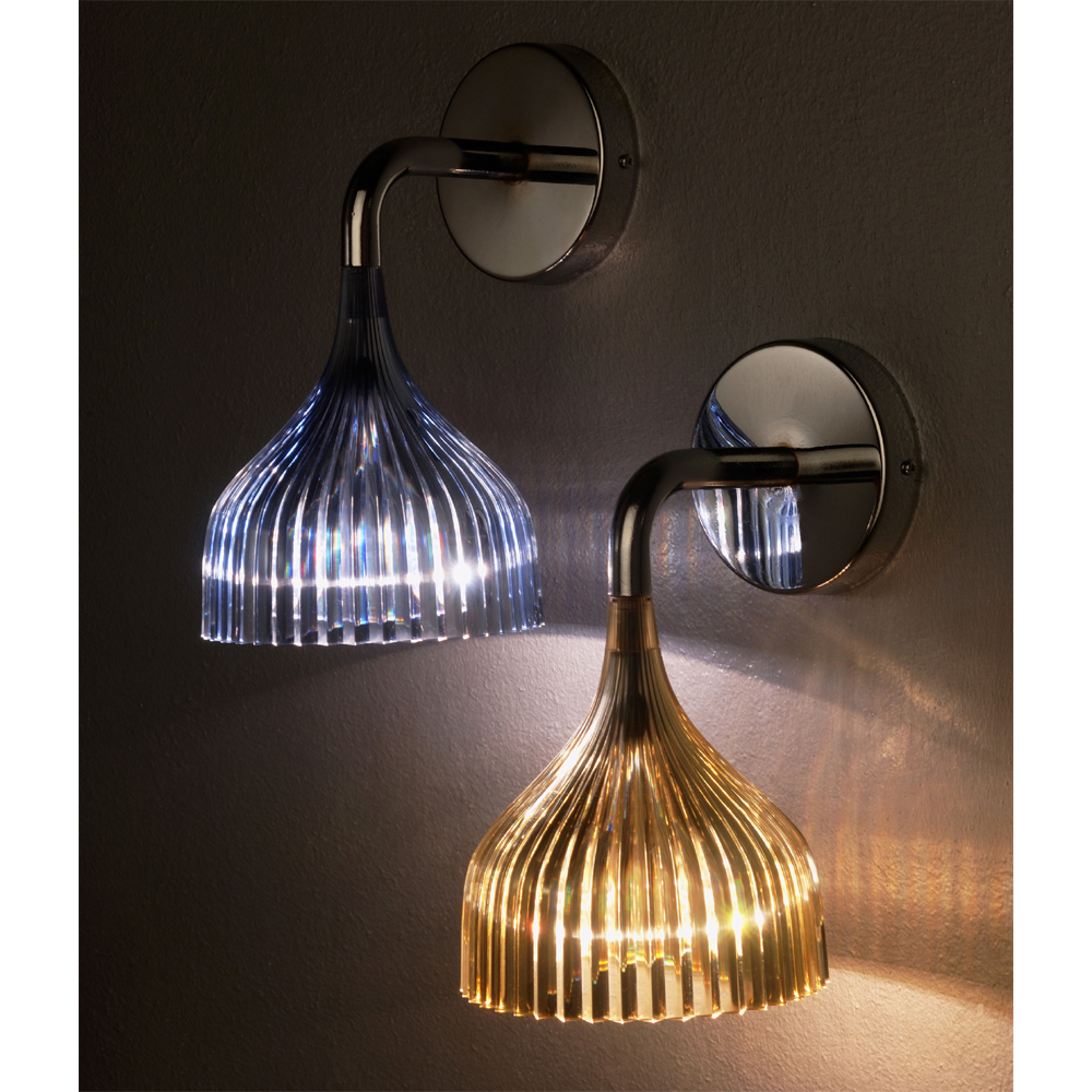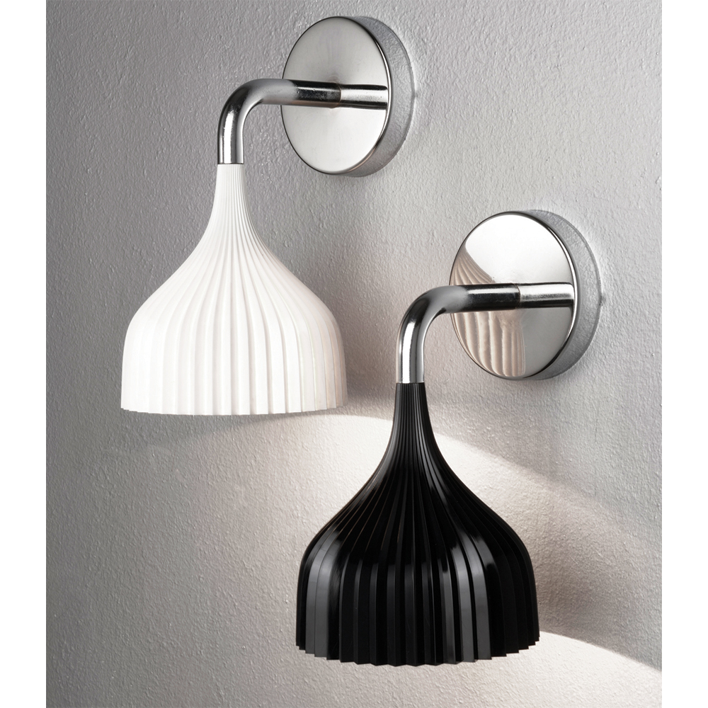 Die Wandleuchte besteht aus einem runden Schirm aus plissiertem Polycarbonat, der in verschiedenen Farbvarianten erhältlich ist, und einem 11 cm langen Arm aus verchromtem Metall. Die Hängeleuchte dieser Serie besteht aus einem Schirm aus plissiertem Polycarbonat und einer Deckenrose aus verchromtem Metall. Die Aufhängung ist zwischen mindestens 20 cm und höchstens 220 cm höhenverstellbar.
