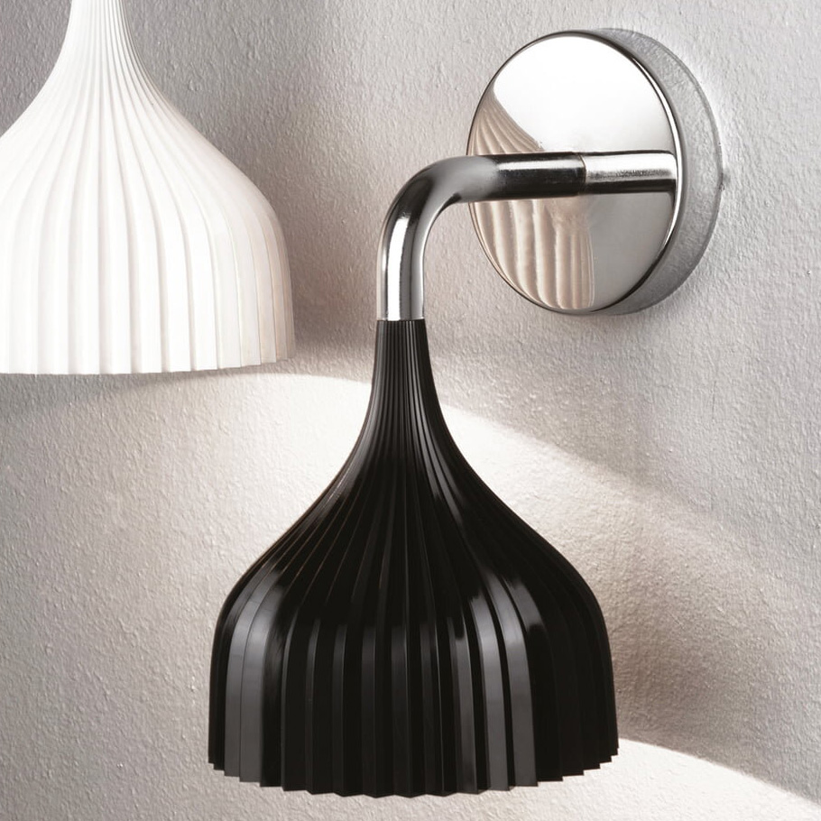 Die Wandleuchte besteht aus einem runden Schirm aus plissiertem Polycarbonat, der in verschiedenen Farbvarianten erhältlich ist, und einem 11 cm langen Arm aus verchromtem Metall. Die Hängeleuchte dieser Serie besteht aus einem Schirm aus plissiertem Polycarbonat und einer Deckenrose aus verchromtem Metall. Die Aufhängung ist zwischen mindestens 20 cm und höchstens 220 cm höhenverstellbar.