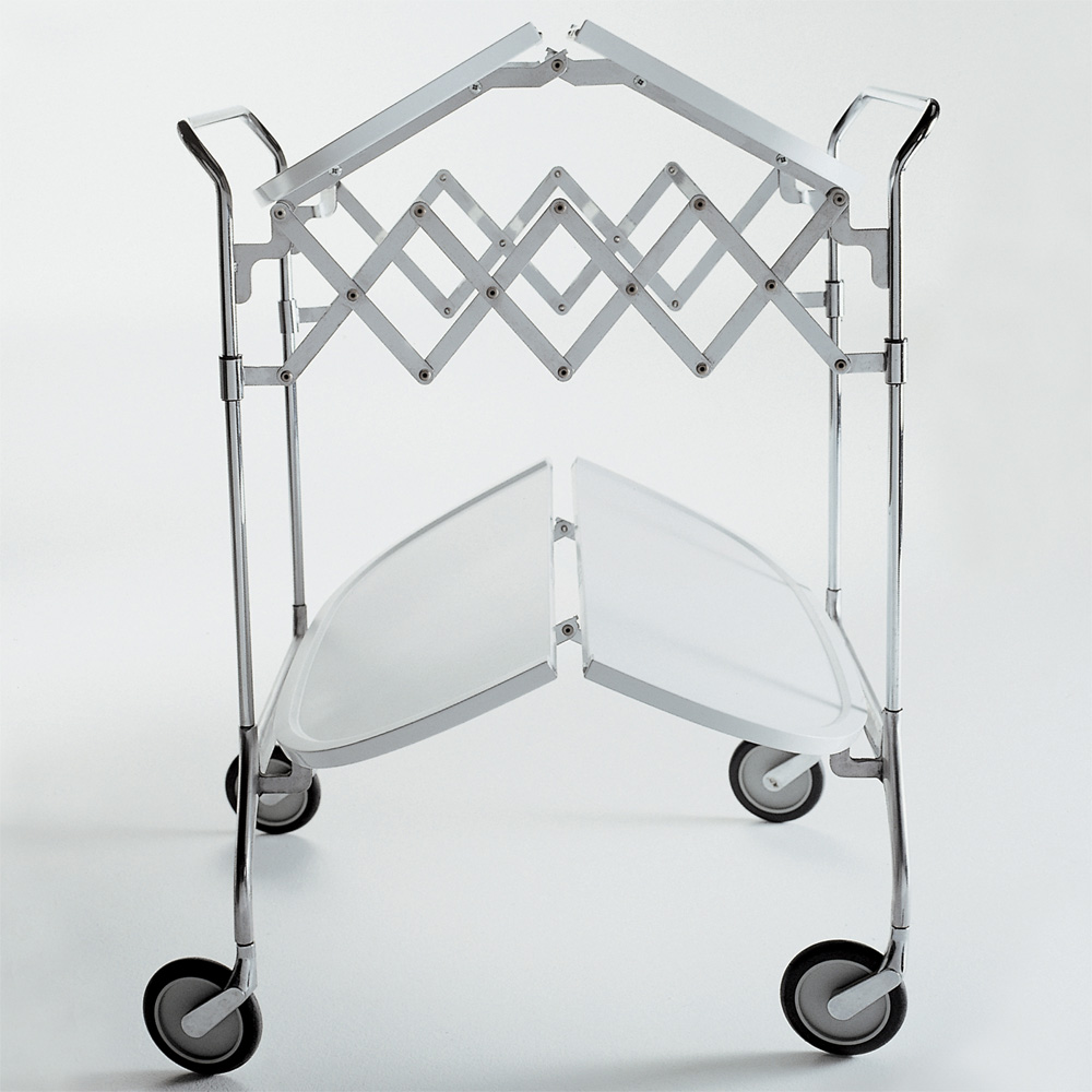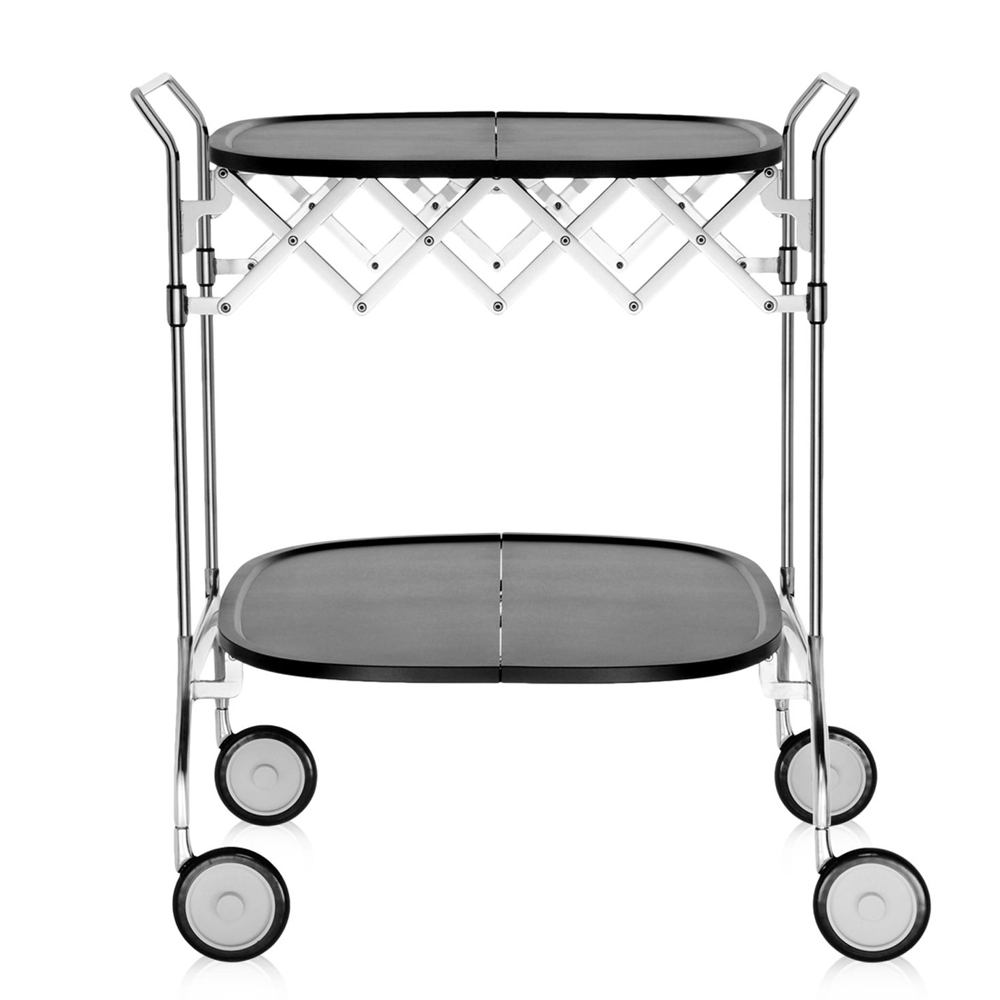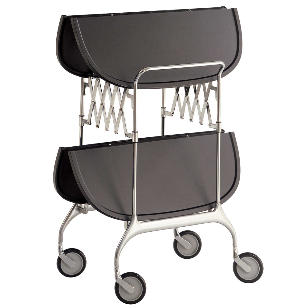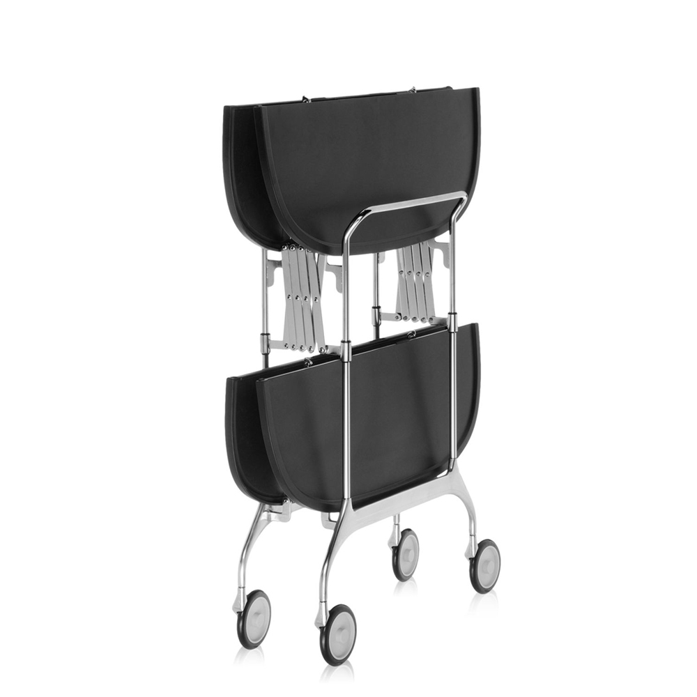 Gastone ist ein eleganter ausklappbarer Rollwagen mit einer Platte aus lackiertem Kunststoff und einem Gestell aus verchromtem Stahl. Fünf verschiedene Farben stehen zur Auswahl: Weiß, Schwarz, Blau, Pflaume und Sahne. Die Rollen bilden hier das formal charakterisierende Element und sie stellen eine funktionelle Mobilität sicher. Zusammengeklappt ist der Wagen 23 cm tief. Das Ausklappen ist kinderleicht und bequem.