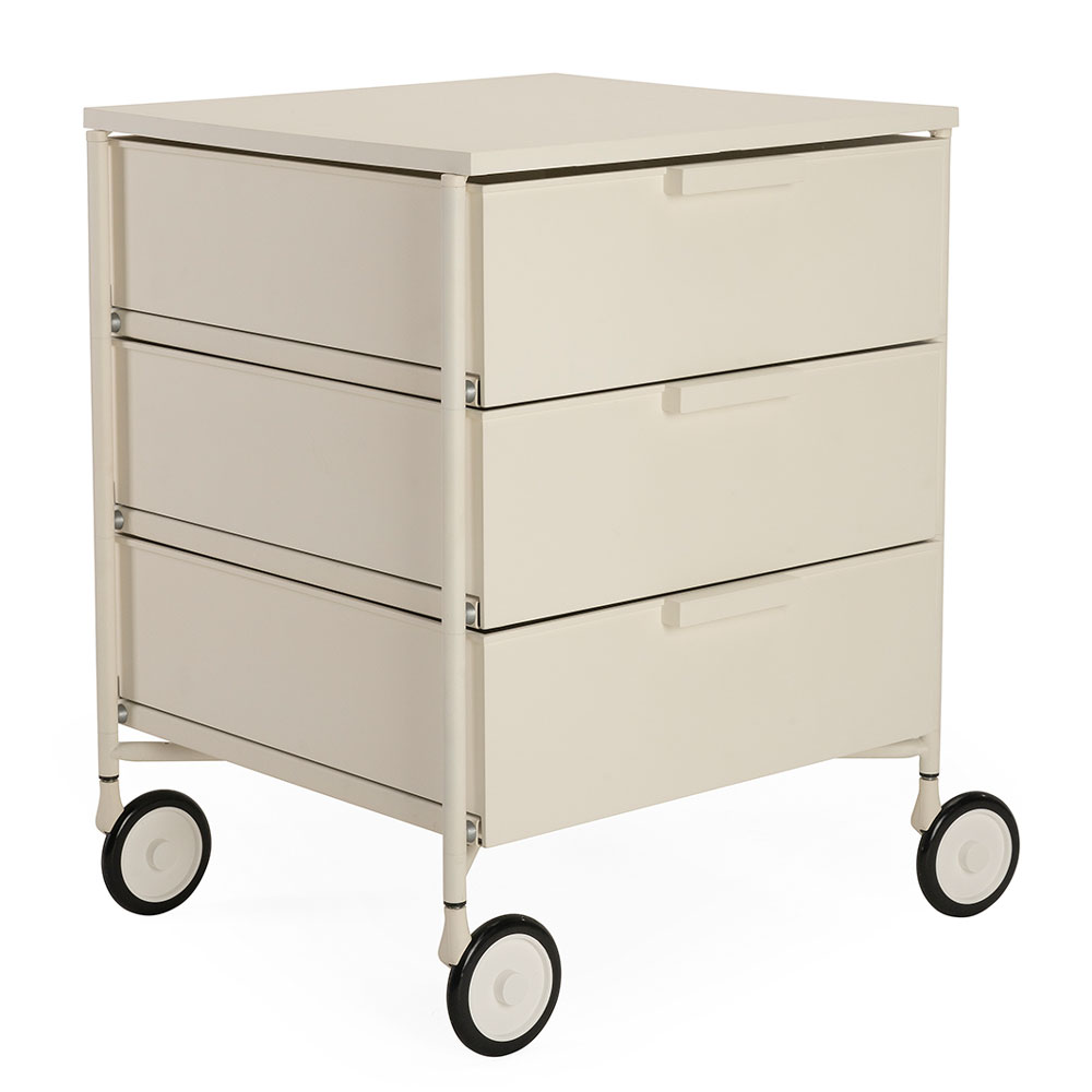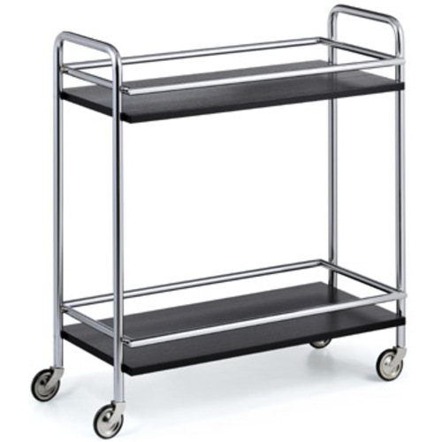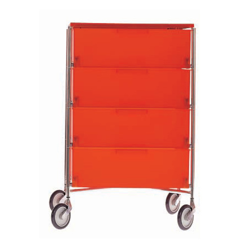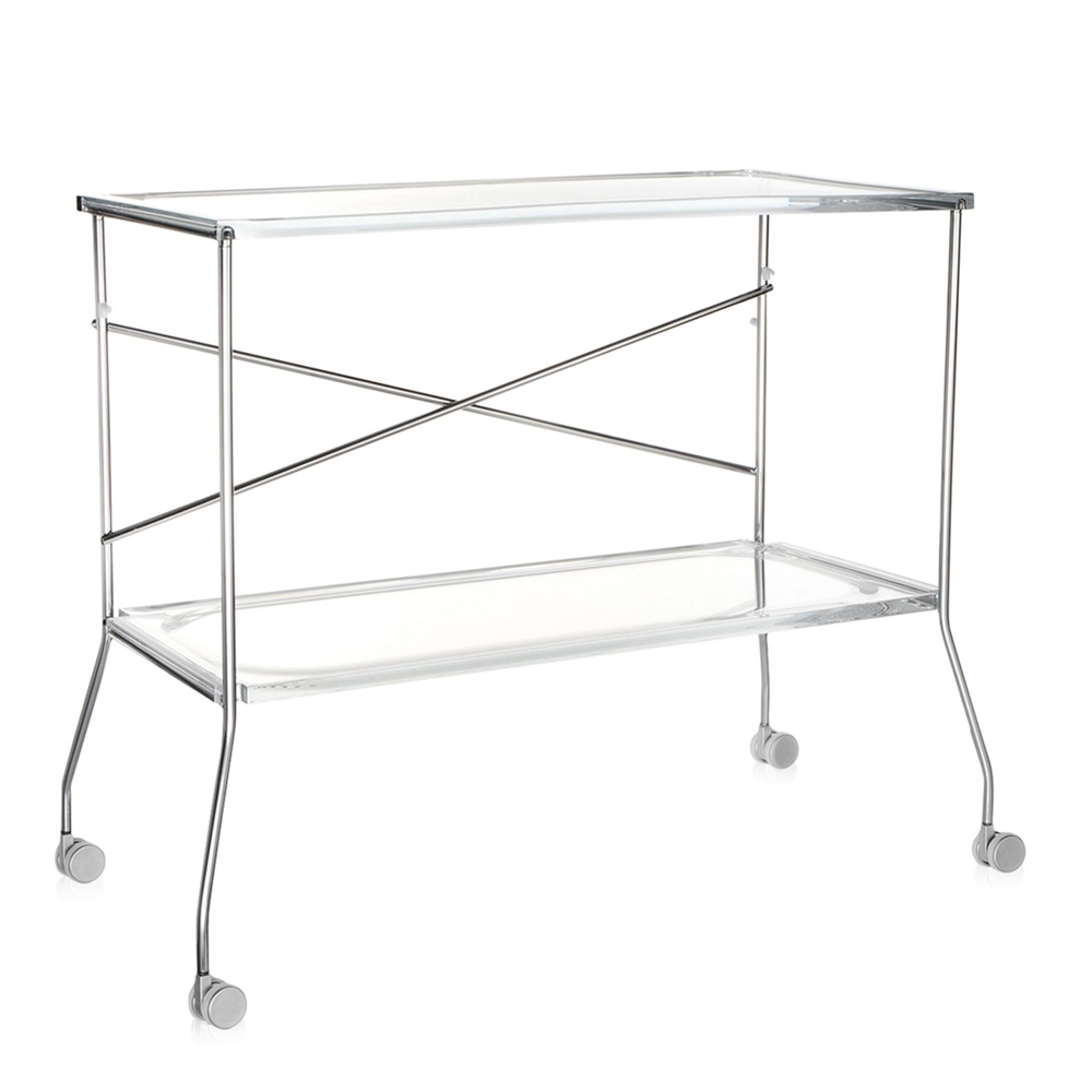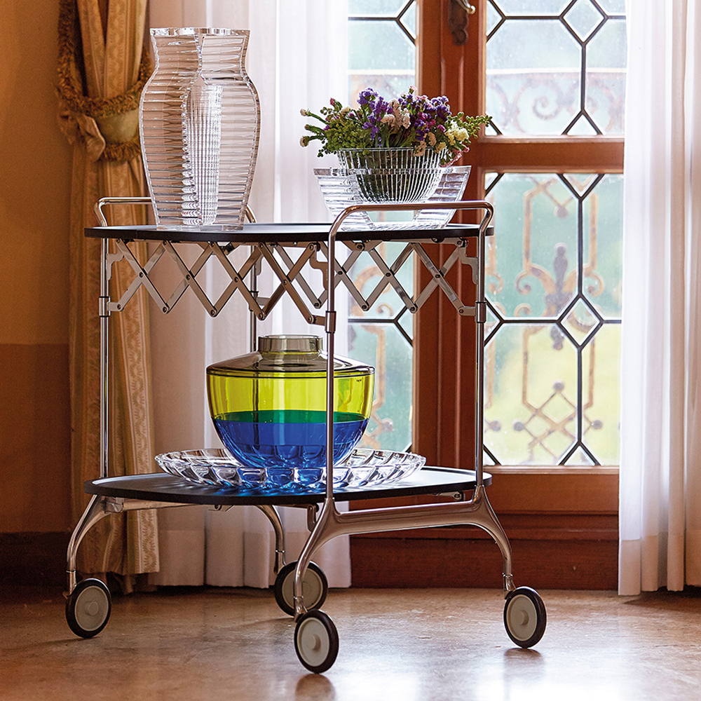 Gastone ist ein eleganter ausklappbarer Rollwagen mit einer Platte aus lackiertem Kunststoff und einem Gestell aus verchromtem Stahl. Fünf verschiedene Farben stehen zur Auswahl: Weiß, Schwarz, Blau, Pflaume und Sahne. Die Rollen bilden hier das formal charakterisierende Element und sie stellen eine funktionelle Mobilität sicher. Zusammengeklappt ist der Wagen 23 cm tief. Das Ausklappen ist kinderleicht und bequem.