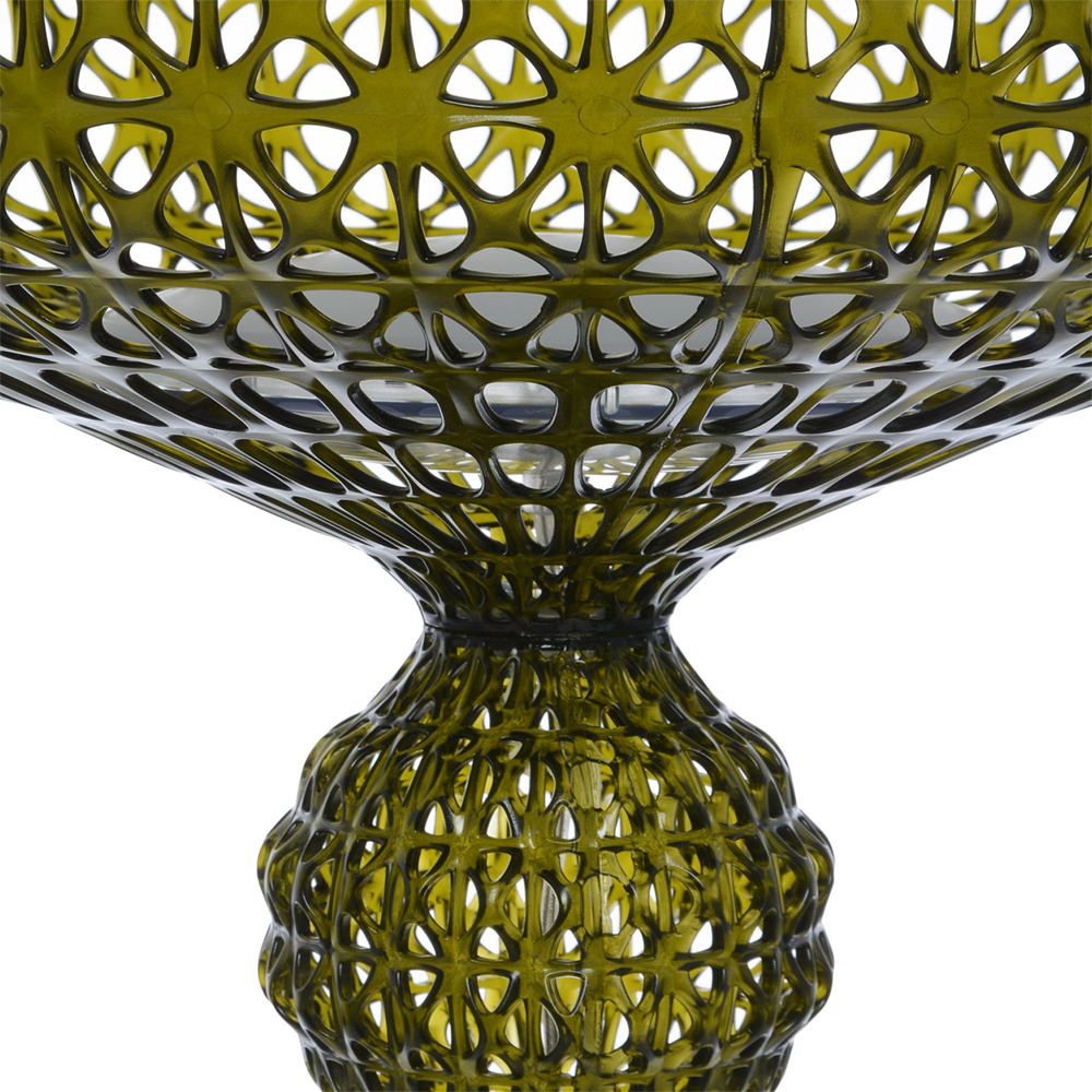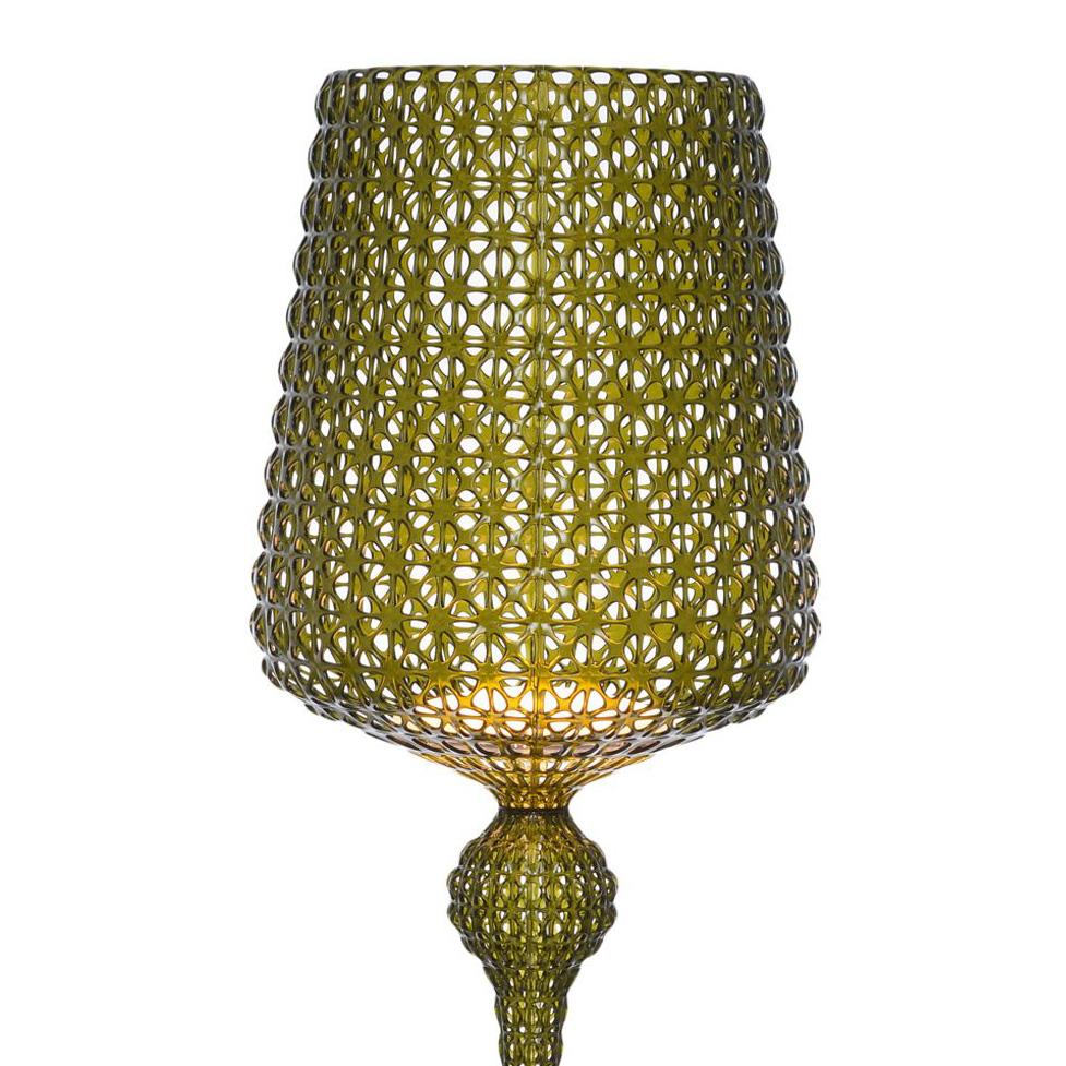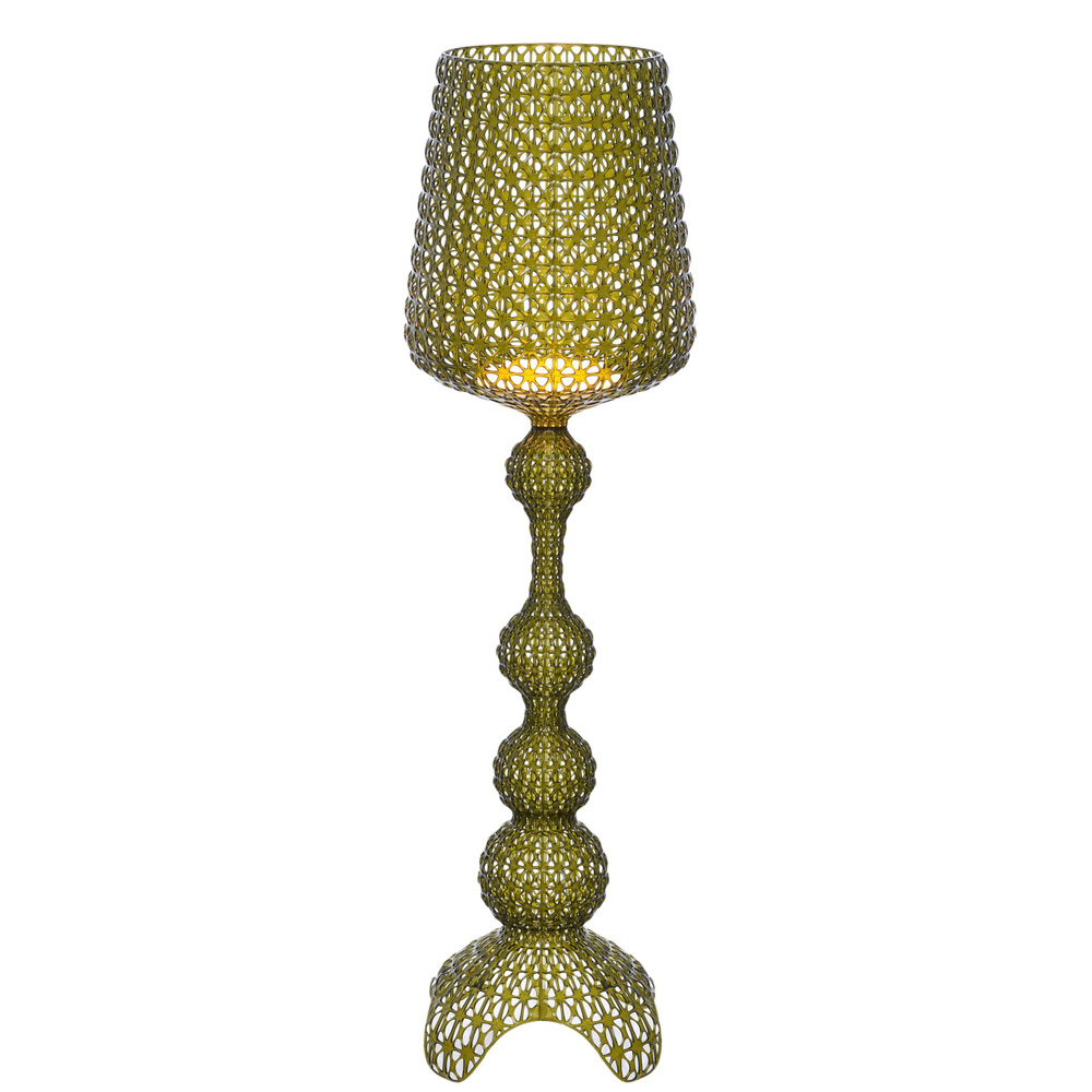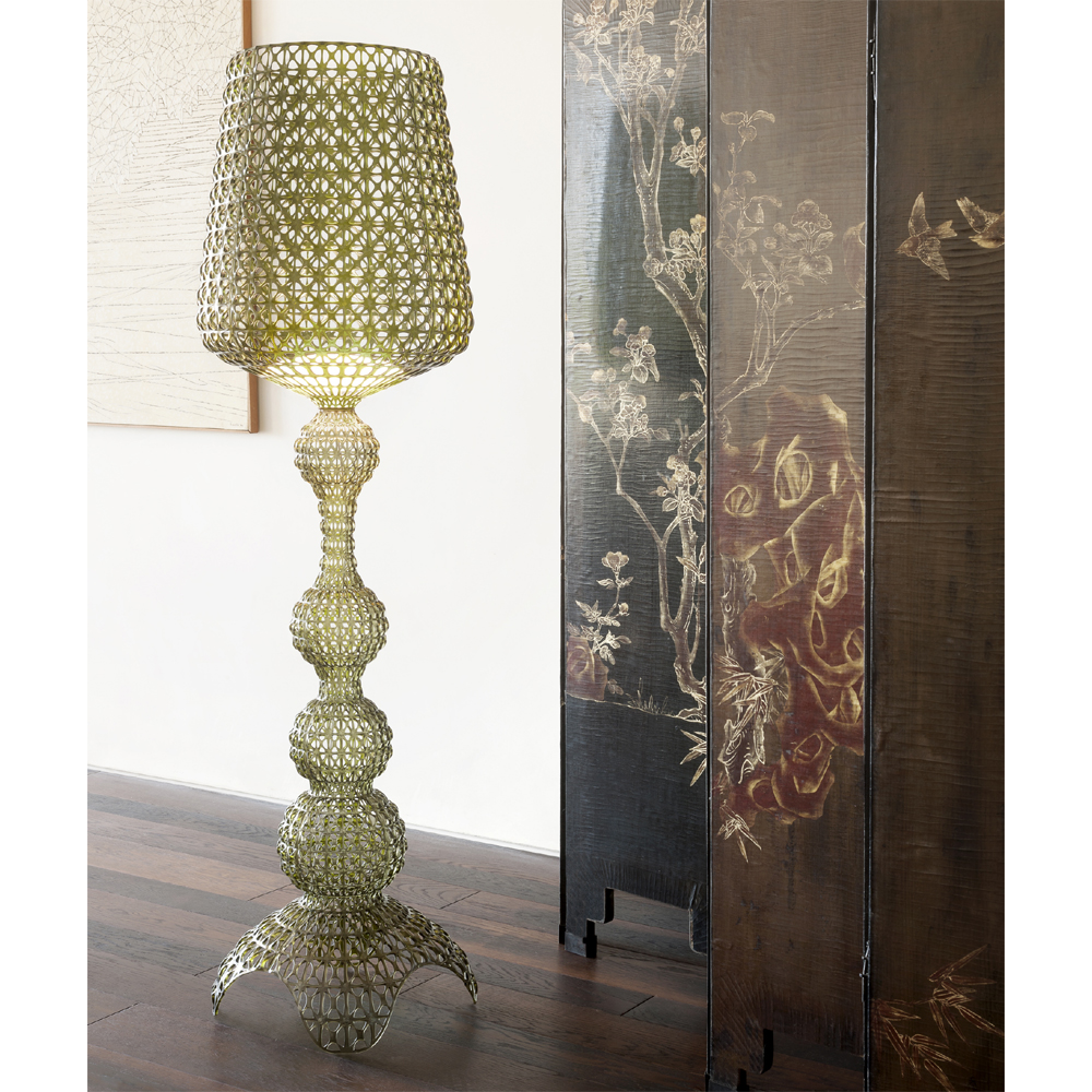 Die grüne Stehleuchte Kabuki entsteht im Spritzgussverfahren. Die technische Raffinesse dieses Verfahrens ermöglicht es, eine Struktur mit einem Muster zu erhalten, das Spitze nachahmt, die besondere perforierte Oberfläche streut das Licht.