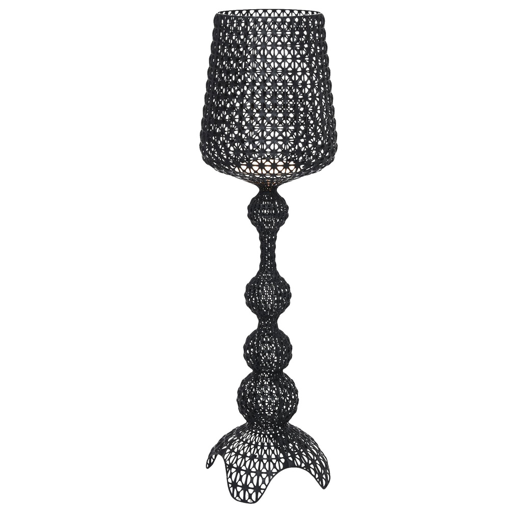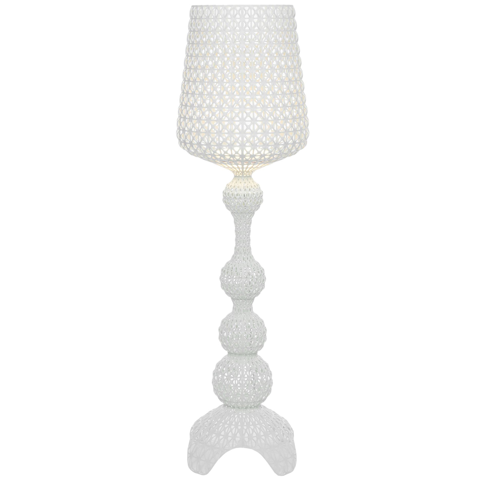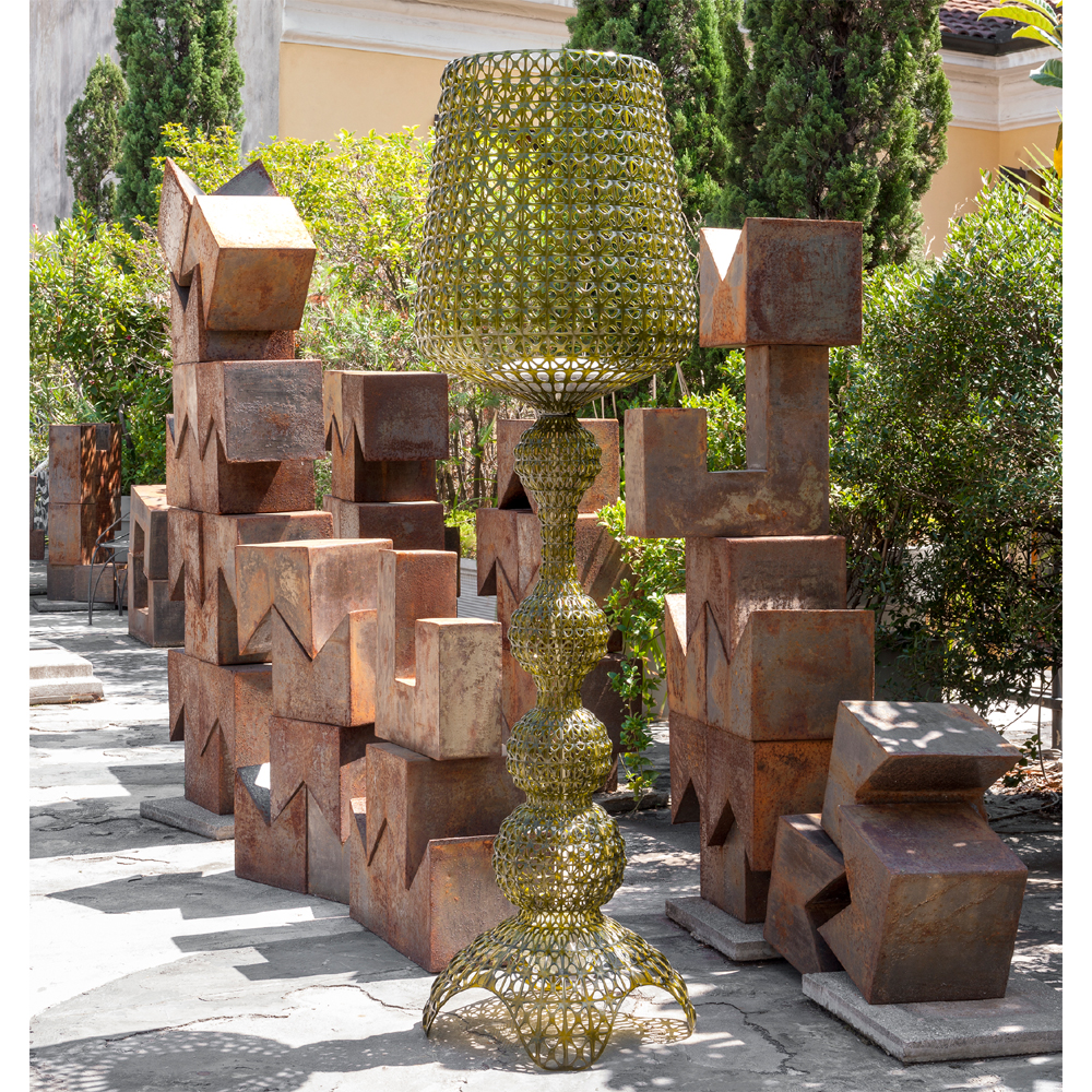 Die grüne Stehleuchte Kabuki entsteht im Spritzgussverfahren. Die technische Raffinesse dieses Verfahrens ermöglicht es, eine Struktur mit einem Muster zu erhalten, das Spitze nachahmt, die besondere perforierte Oberfläche streut das Licht.