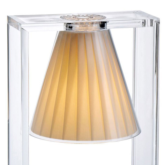 Das Gestell setzt ein starkes graphisches Zeichen. Es besteht aus einem rechteckigen Rahmen aus transparentem oder durchgefärbtem thermoplastischem Technopolymer, der im Inneren einen kegelförmigen Parabolreflektor enthält, in dessen Inneren sich plissierter Stoff befindet.