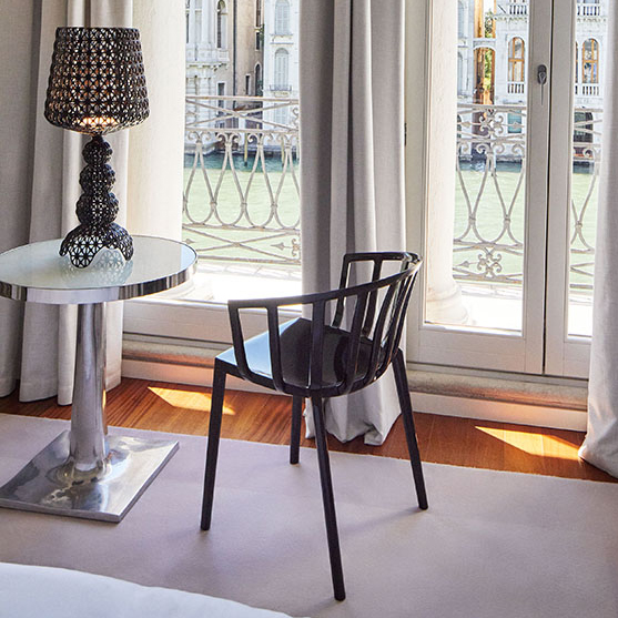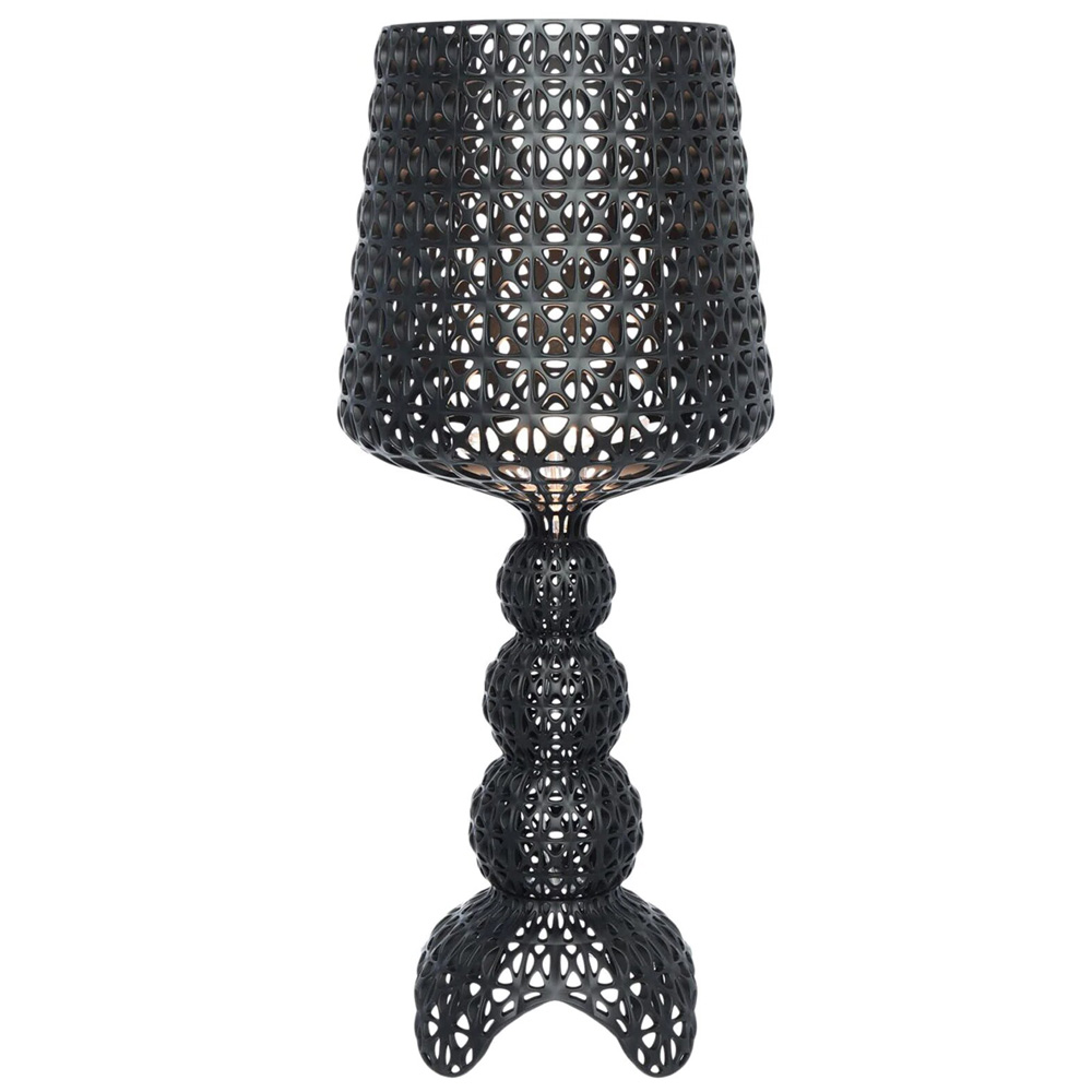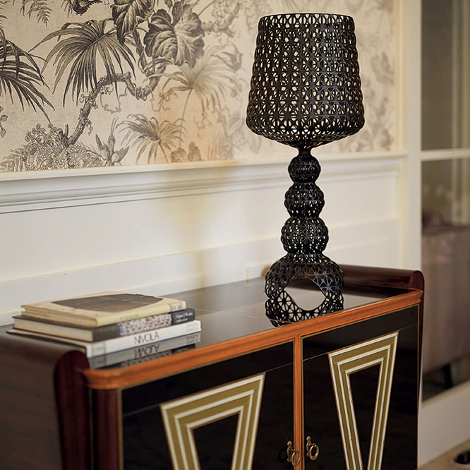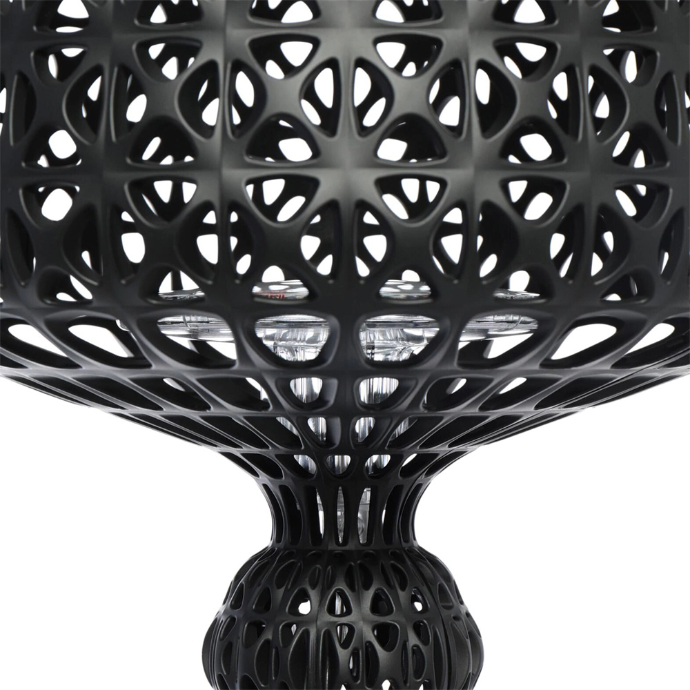 Die schwarze Tischleuchte Kabuki entsteht im Spritzgussverfahren. Die technische Raffinesse dieses Verfahrens ermöglicht es, eine Struktur mit einem Muster zu erhalten, das Spitze nachahmt, die besondere perforierte Oberfläche streut das Licht.