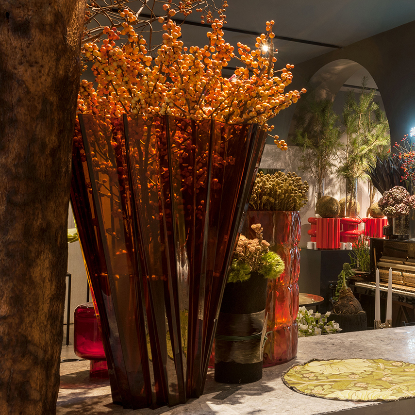 Eine facettierte bernsteinfarbene Vase, die sich nach oben hin öffnet, als ob sie von einer wirbelnden Bewegung angetrieben ist, was ihr Licht und Biss verleiht. Wie eine Lichtbrechung, die aus einem Bruch der Kristalle in einem Wechsel von Licht und Schatten freigesetzt wird, schafft Shanghai unregelmäßige geometrische Formen mit einem vielgestaltigen und vielfarbigen Charme, wie die Stadt in Asien, der die Vase ihren Namen verdankt.