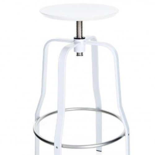 Wiederaufgelegt in aktueller Art und Weise, hat er als charakteristisches Element ein Schraubgewinde, das die Sitzhöhe reguliert. Eine leicht konkave Scheibe als Sitzfläche und vier schlanke Metallbeine, an einem Kreis befestigt, garantieren seine Stabilität.
