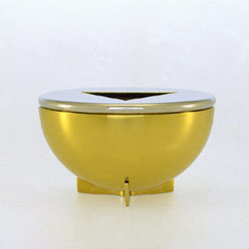 Eine Halbkugel aus Messing, die auf drei dreieckigen Füßen steht, wird durch eine vernickelte Kappe abgedeckt, die einen dreieckigen Ausschnitt für die Asche hat.