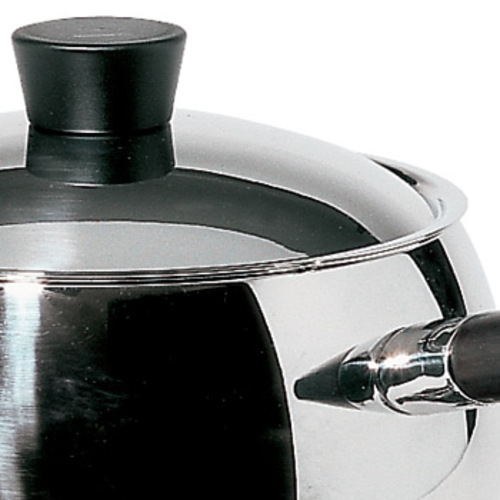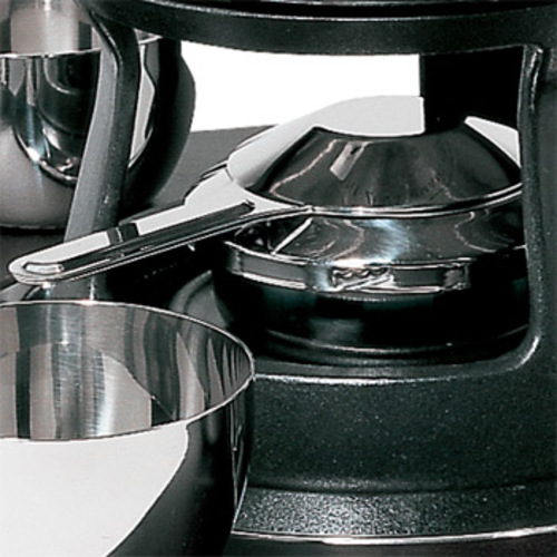 Bourguignonneset bestehend aus: Topf aus Edelstahl 18/10 mit wärmestrahlendem Edelstahlboden und Griff aus schwarzem Holz, Rechaud aus Gußeisen, Brenner und Unterteller aus Edelstahl 18/10.