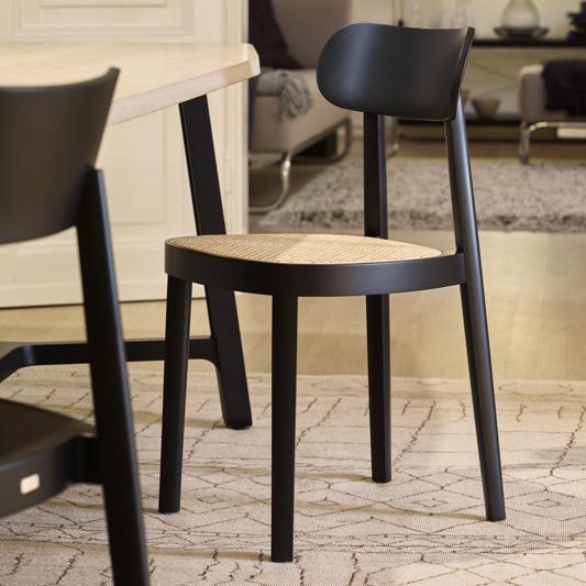 Minimalistisch und ehrlich, dabei elegant und filigran: Der 118 ist ein klassischer Holzstuhl, der an jedem Esstisch, in jedem Restaurant für subtile Eleganz sorgt. Das Prinzip, einen Stuhl auf möglichst wenige Bestandteile zu reduzieren, wurde von Michael Thonet bereits Mitte des 19. Jahrhunderts eingeführt. Der Stuhl 118 ist eine Weiterentwicklung, welche das Erbe des Unternehmens bedenkt - und noch einen Schritt weiter geht. Sebastian Herkner ergänzt raffinierte Details, die den Entwurf weniger dominant, dafür umso vornehmer machen. Eine weitere Besonderheit stellt die Form der Stuhlbeine dar: Auf ihrer Außenseite sind sie gerundet, auf der Innenseite gerade - eine Gestalt, die die hufeisenförmige Grundfläche des Sitzes aufnimmt. Auf den Urtyp eines Thonet-Bugholzstuhls, den 214, beziehen sich der aus einem Stück gebogene Sitzrahmen sowie die mit Rohrgeflecht bespannte, in Handarbeit verarbeitete Sitzfläche.