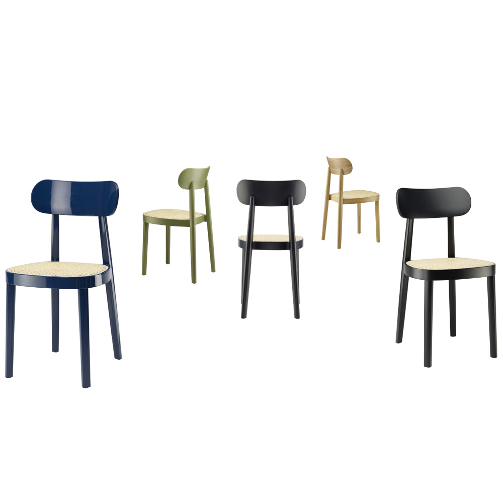 Das Charakteristische bei der Serie 01x ist das Raster aus halbkugelförmigen Vertiefungen in der Sitzfläche und die besonders geformte Befestigung der Rückenlehne. Der Sitz besteht aus massiver stabverleimter Birke, die Rückenlehne aus Birke Sperrholz, natur oder farbig gebeizt. Gestell aus Stahl, pulverbeschichtet, Chrom oder Mattchrom. Polsterung der Sitzfläche mit Stoff oder teilgepolsterte Rückenlehne möglich. Sitzfläche für Projekte auch ohne Vertiefungen lieferbar.